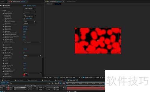5、 新建合成与固态层,开始设置Particular效果。增大粒子的Size X,使其铺满屏幕,调整位置至下方,将重力设为负值,让粒子从下往上飘动。增加粒子尺寸与随机性,提高每秒发射数量,并更改颜色。最后再创建一个固态层作为背景使用。
