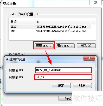 3、 新建环境变量,变量名设为MAYA_UI_LANGUAGE,值为zh_CN则启用中文界面,值为en_US则启用英文界面,请按需修改。
