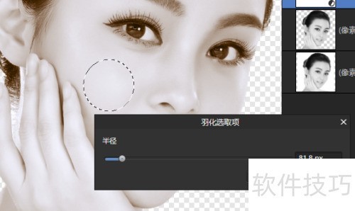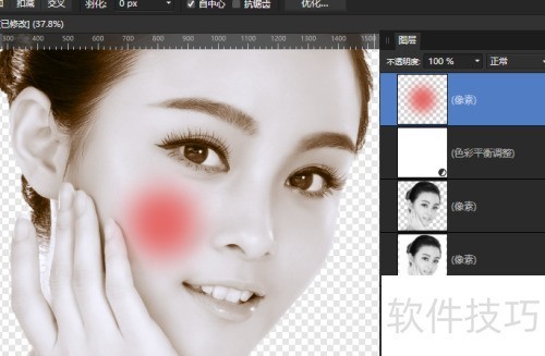 7、 在腮部画个圆形选区,添加羽化,效果。