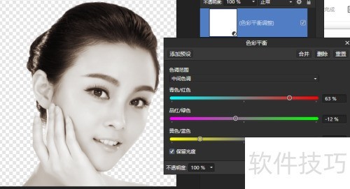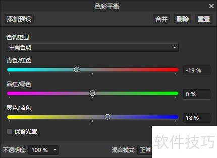 4、 执行指令,在弹出的色彩平衡对话框里先调整中间调,参数见图。