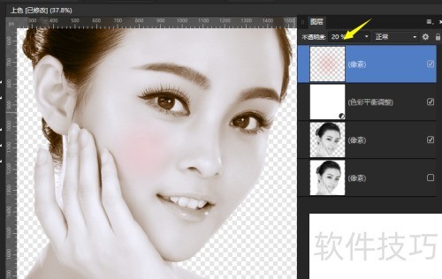 9、 像图中那样,把淡红色图层不透明度设为20%左右就行。