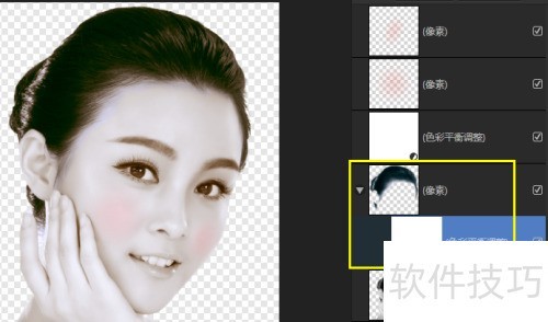 13、 选择复制好的头发图层,再调出色彩平衡命令,让头发颜色偏黑些,只需调整青色和蓝色即可。不过要注意,必须使色彩平衡和头发建立蒙版关系,如此才能仅对头发调色,所示。