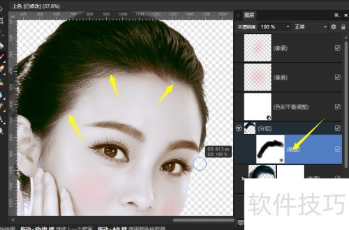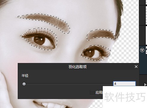 15、 用徒手选取工具选中眉毛和眼睛区域,加4像素羽化值,效果。