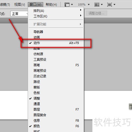3、 接着,打开动作面板,开启方式所示,十分便捷。