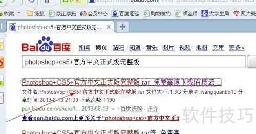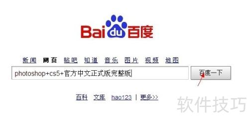 1、 在网络搜索(photoshop+cs5+官方中文正式版完整版),点击第一个搜索结果进入页面(此版本大小为1.3G)。其他精简版多为957.2M或者更小,我觉得这些精简版可能没有bridge软件。