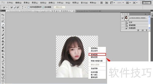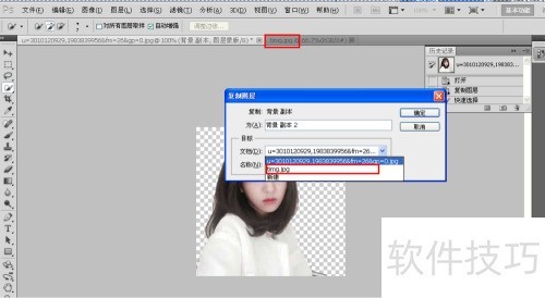 7、 在图中美女有马赛克的地方点右键,选,此时会弹出对话框,目标文档就选打开图片的同名文档,确定后,抠图部分就到新图里了。