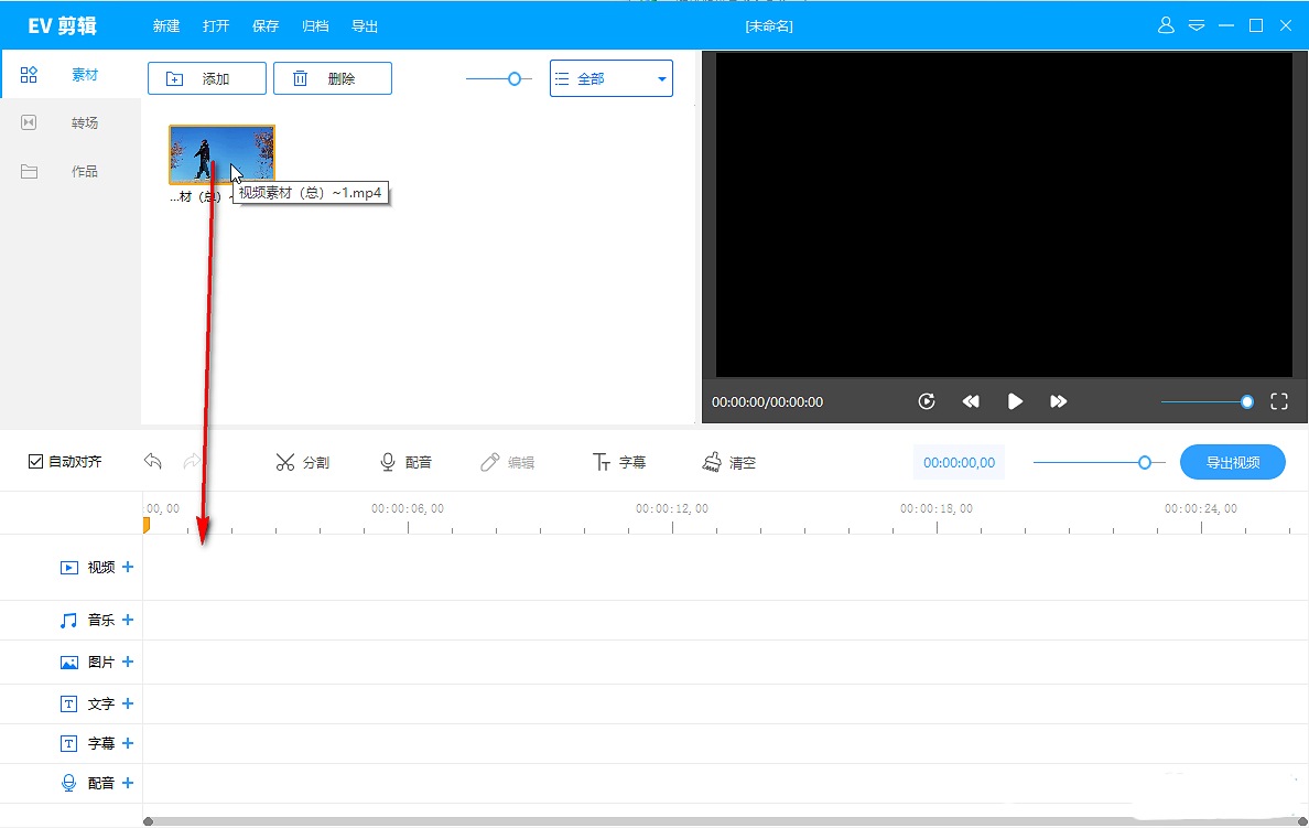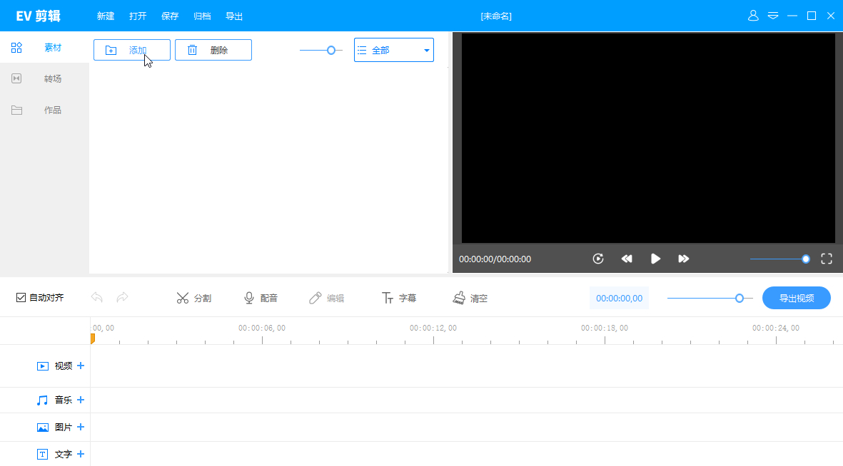 1、启动ev剪辑软件,点击“添加”按钮导入需要进行修改的视频。