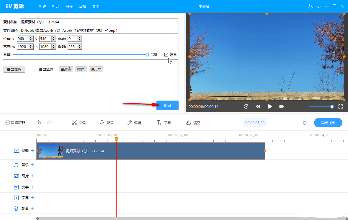 4、在编辑的窗口可以看到“静音”选项,不要勾选“静音”选项,就可以保留视频原声,然后点击“返回”即可。