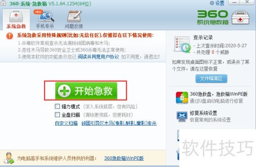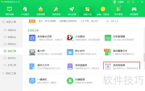利用360安全卫士的系统急救箱功能,能够解决多数系统故障,具体操作如下: