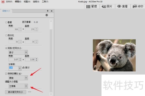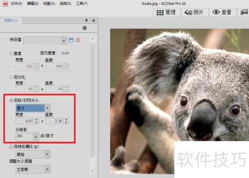 5、 若要用acdsee修改图片分辨率,可选择实际/打印大小,在此处既能改分辨率,又能调整图片的宽和高。