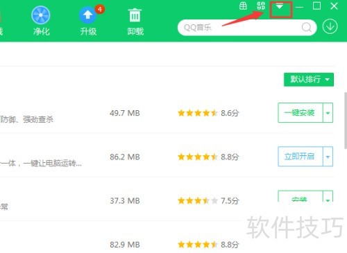 2、 打开360安全卫士,接着点击右上角的倒三角符号。