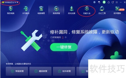 1、 启动应用软件后,点击功能区的功能大全图标。