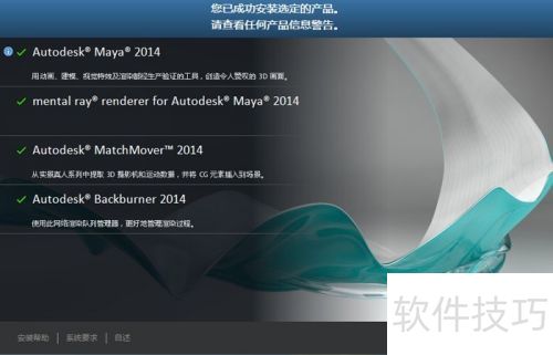 7、 安装程序安装完毕会出现提示界面,能看到已安装组件名称,鼠标左键单击按钮,Maya2014便正常安装好了,所示。