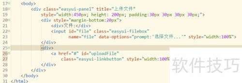 3、 第三步,于body标签中添加一个panel与filebox,设置其样式,再在其下方插入上传文件按钮,配置相应元素样式,效果所示。