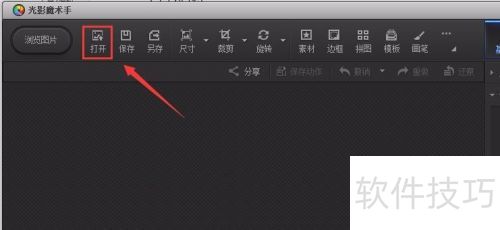 2、 在界面上方菜单中找到打开选项,所示。