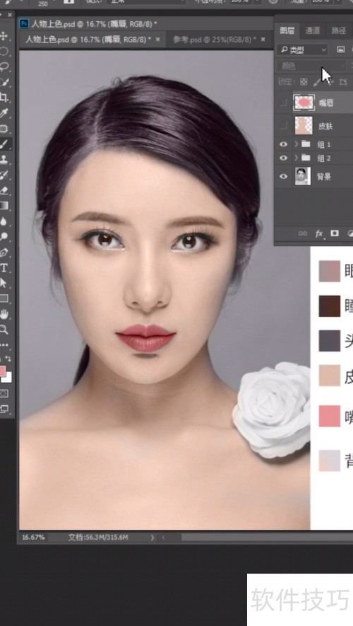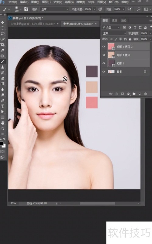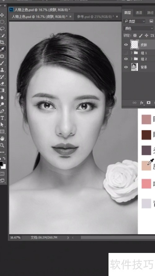 1、 先找一张彩色人物照片作参考,再用吸管工具把颜色提取出来。