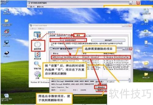 3、 点击启动设置后,可所示选择要删除的项目,接着点设置,再选否,下次重启计算机时删除所选项目。