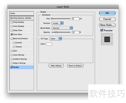 10、 单击图层 > 图层样式 > 描边,于大小选项选1,不透明度选项选25%。此操作可实现特定视觉效果,简单调整让设计更出彩,快尝试吧。
