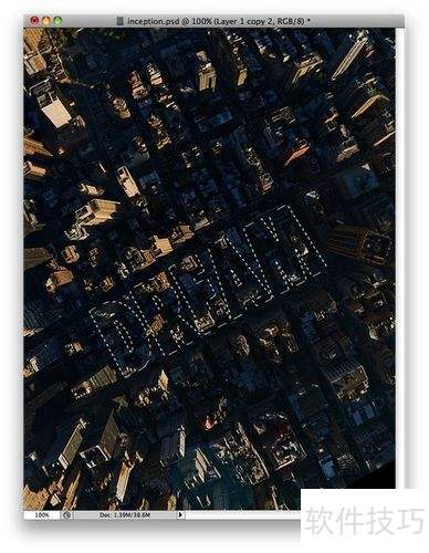 9、 复制城市图片图层,重新拖动至所有图层最上方。然后在3D文字DREAM上方创建选区,依次点击图层(Layer)—图层蒙版(Layer Mask)—显示选区(Reveal Selection)即可完成操作。