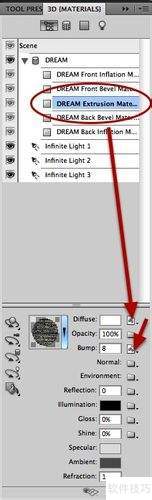 4、 首先,点击窗口并打开3D面板。接着,选中文字DREAM,在3D面板里调整DREAM Extrusion Material,以修改材质的挤压效果。随后,在色彩模糊(Diffuse Color)选项旁的小文件夹中,选择新建纹理(New Texture)。单击旁边的小图标,挑选编辑纹理,从而开启一个新的文档进行设置。