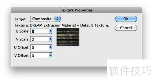 7、 点击材质标志,接着选择纹理属性,在U Scale一栏输入8,V Scale一栏输入2,其余两项保持为0即可。这样设置可调整纹理比例,实现所需效果。