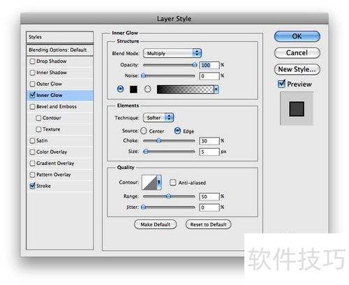 11、 在图层样式中选择内发光,将混合模式设为多重,不透明度调至100%。 choke值设为30%,大小设置为5像素,从而营造出精致的发光效果。 这种设置能让元素更具立体感和视觉吸引力,适合用于突出显示重要部分或创建特殊效果。