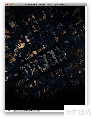 13、 选一张俯瞰图,置于所有图层底部,点击图层遮罩中的显示全部。用画笔工具选择一个边缘非常柔和(硬度为0)的黑色画笔,涂抹字母下方的建筑,这样就能把DREAM字母中的建筑物自然嵌入场景中。如果需要,还可以在字母的一些小角落添加虚光效果以增强氛围,具体设计可根据个人喜好调整。