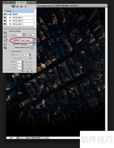 14、 为了强化3D效果,打开3D面板后,选择场景选项,在渲染设置中将质量调整为Ray Traced Final。需要注意的是,渲染可能需要几分钟时间,请耐心等待,直至渲染完成。虽然过程稍长,但请务必坚持到成功渲染为止。