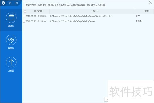 19、 信任区功能:若无需对某个文件进行病毒扫描,可将其加入信任区。信任区允许添加文件或文件夹,并支持撤销信任。被列入信任区的文件及文件夹将不参与任何病毒查杀操作,包括静态扫描与主动防御扫描。