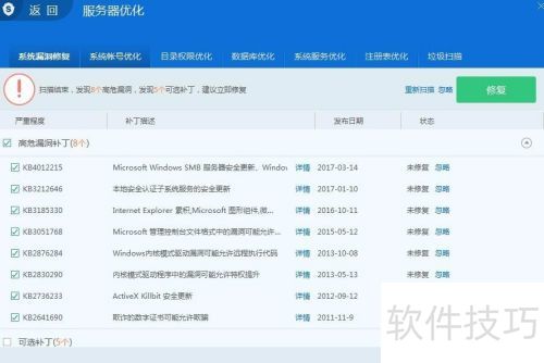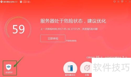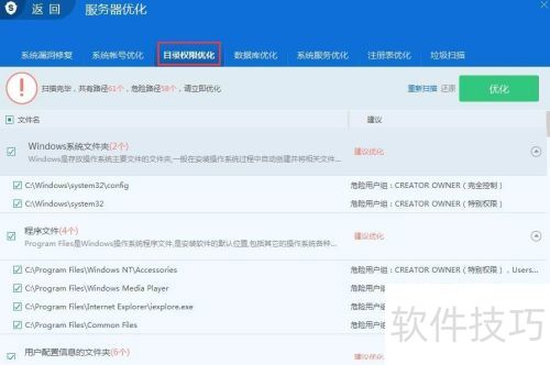 10、 点击服务器优化进入,此功能主要针对系统漏洞、目录权限、注册表及垃圾文件进行优化处理,有效提升系统运行效率。