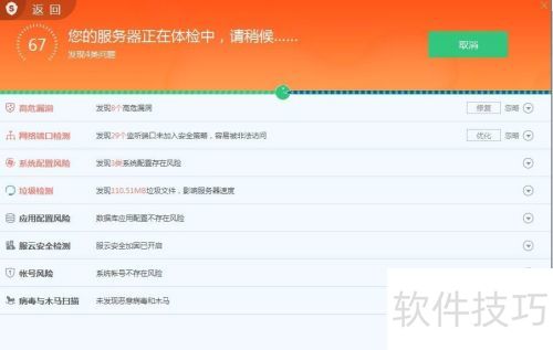 9、 服务器体检功能可全面检测服务器,发现潜在的安全漏洞等问题。若发现问题,用户可根据提示和自身需求,对系统进行修复操作。