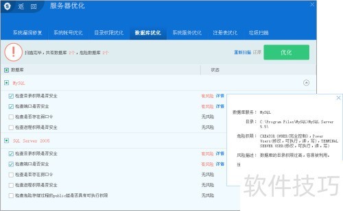 15、 数据库优化:扫描系统中的数据库(如MySQL和MSSql),检查是否存在危险权限,避免因数据库提权带来严重后果。