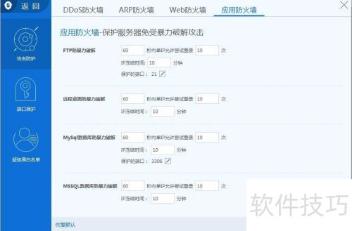 35、 应用防火墙主要保障服务器安全,防止暴力破解攻击。目前提供四项功能:FTP、远程桌面、MySql及MSSQL的防暴力破解保护,有效提升服务器防护能力。