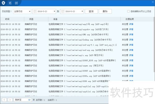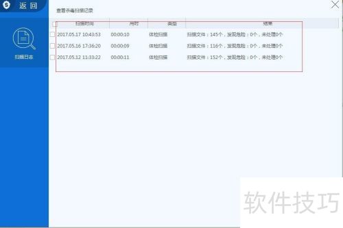22、 杀毒扫描完成后,日志将记录扫描历史,用户可依据情况处理,支持删除或清空记录。
