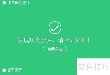 32、 主动查杀时,若发现病毒,右下角将弹出提示框。点击查看详情,即可跳转至防护日志页面,查看拦截详情。