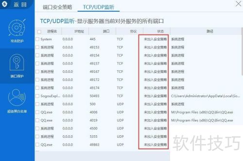 37、 TCP 和 UDP 监听功能可让用户查看当前的 TCP 与 UDP 连接情况。通过该功能,用户能够获取开启端口的进程名称、通讯类型(TCP 或 UDP)、风险状态及进程路径等详细信息。点击加入安全策略,可将选定进程设为可信安全进程,同时支持取消信任设置。此功能便于用户掌握网络连接状态并管理安全策略。