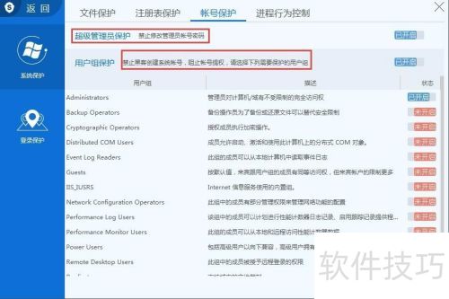 44、 账号保护功能可根据用户选择的保护用户组,实现对账号操作的守护。当用户勾选特定用户组后,在进行账号创建、修改或删除时,服务器安全狗会依据设置提供保护机制。该功能不仅能阻止普通账号的创建,还能有效防范账号提权、账号克隆等其他任何形式的新账号生成操作。建议将系统中需要保护的账号加入账号保护功能,从而更高效地保障服务器的安全运行。