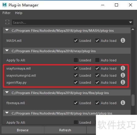 3、 ③开启Maya,通过窗口-首选项-插件管理(Windows>Setings Preferences>Plugin Manager)找到Apply TO All:、vrayformaya.mll、vrayvolumegrid.mill以及xgenVRay.pa这三项内容,接着在Load(加载)和Auto Load(自动加载)前面的复选框中打上对号。