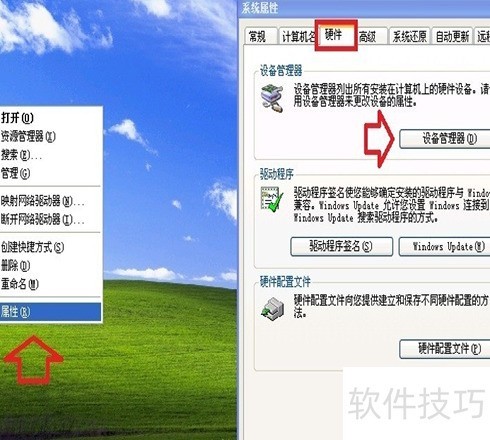 1、 右击此电脑,选择属性,接着点击硬件下的设备管理器。
