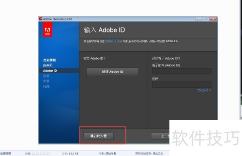 5、 Adobe ID的创建或验证不是必需步骤,可直接点击跳过此步骤按钮继续操作。