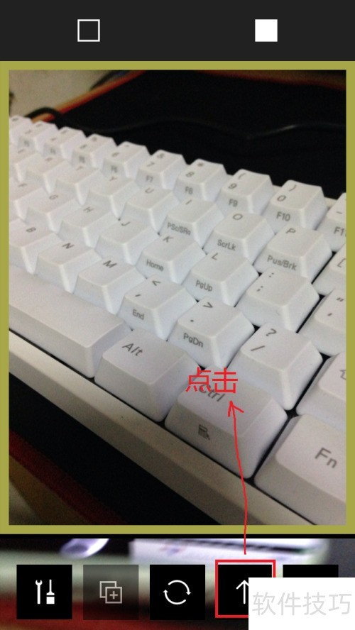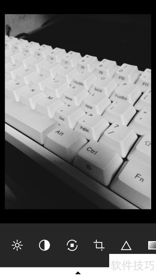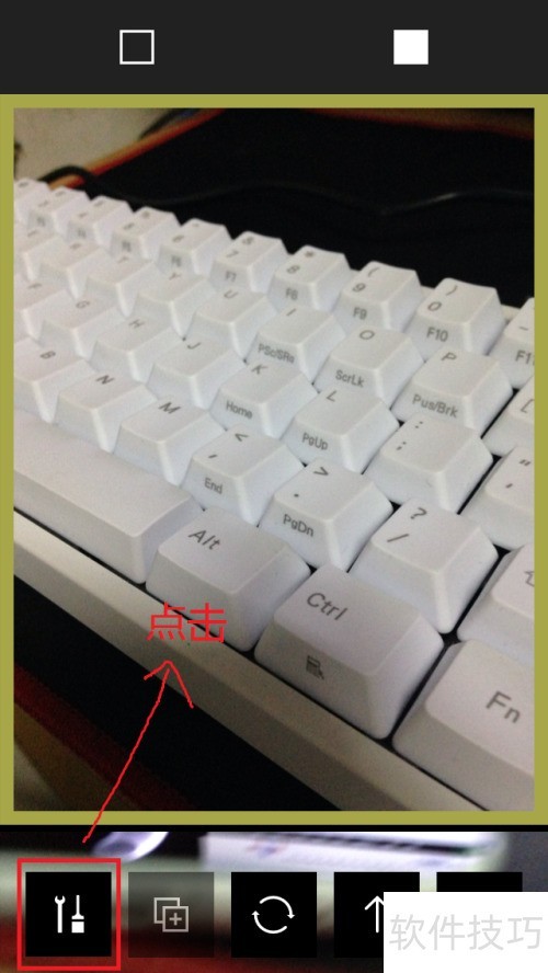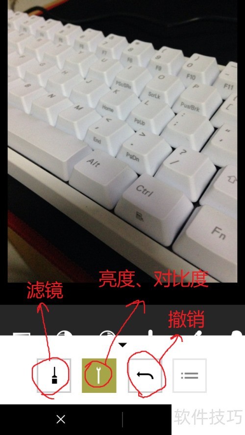 4、 你将看到四个按钮,其一为滤镜,其二用于调整亮度、对比度、锐度等参数,其三是撤销,其四为对比,接着点击第二个按钮。