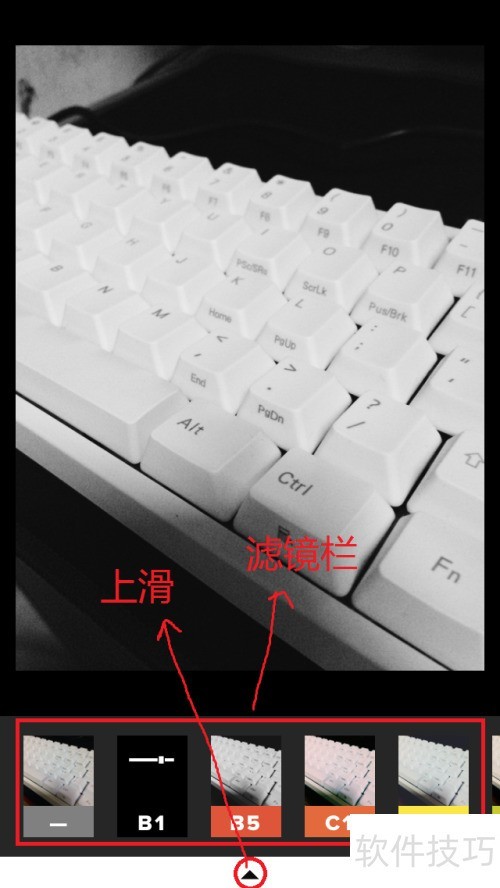 3、 在这个界面下方有不少滤镜,向左滑动滤镜栏能滑出更多效果,然后点击选中想要的效果。选好后,要是对光线、亮度、对比度等参数不满,底部有个倒三角按钮,可点击或上滑此按钮。