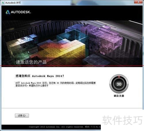 1、 Maya2014是一款试用软件,其试用期限为30天。一旦试用期结束,软件将无法继续使用,必须激活才能恢复功能。接下来介绍一种免费激活的方法。需要注意的是,对于新安装的软件和已超过试用期的软件,激活流程略有不同。特别是刚装好的Maya2014,需要额外增加几步操作,主要区别在于点击激活按钮后弹出的对话框内容不同。用户可以根据自身情况选择合适的步骤进行操作。为了确保教程的完整性,以下激活方法将以全新安装且从未运行过的Maya2014为基础进行详细说明。