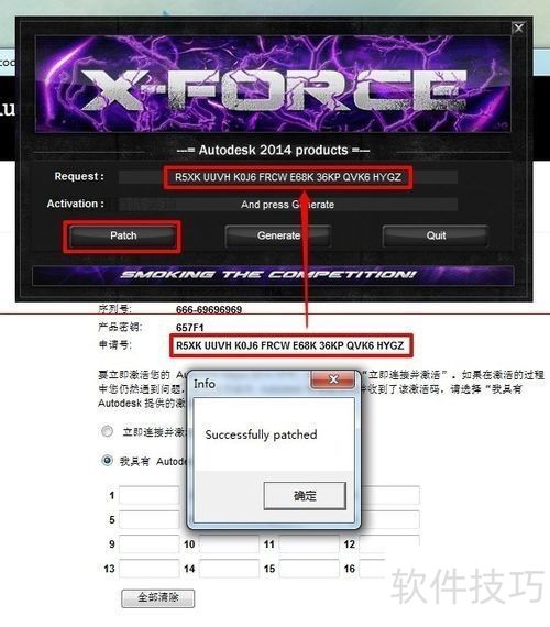 8、 在maya2014激活页面中,把申请号复制到request框内,随后点击patch按钮,再关闭成功提示框。请注意,复制申请号时不能用鼠标右键,需使用ctrl+c快捷键完成操作。