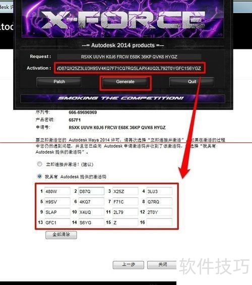 9、 点击注册机中间的generate按钮,将activation框内的激活码复制,粘贴到maya2014的激活码框中,随后点击下一步操作即可。