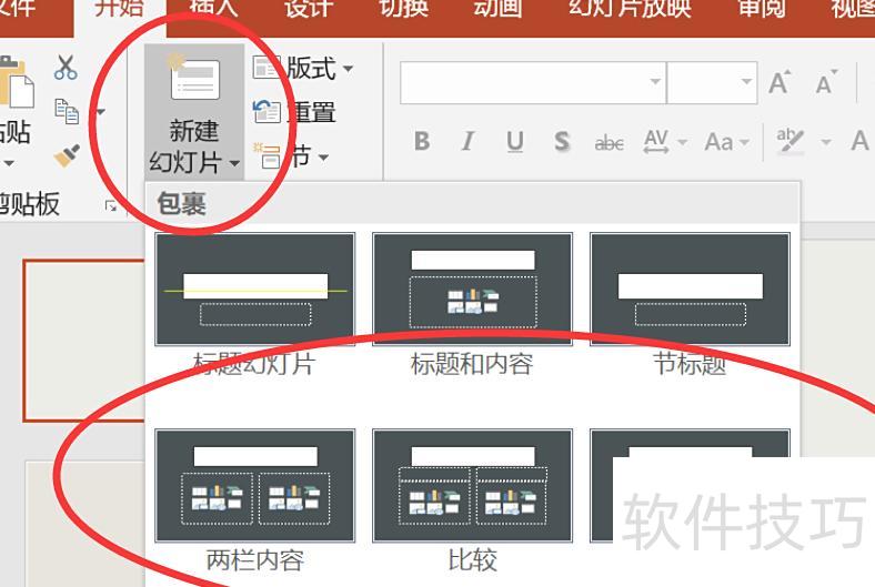 在PPT编辑页面中,点击开始选项卡的新建幻灯片,从中选择已设定好的母版样式进行插入。