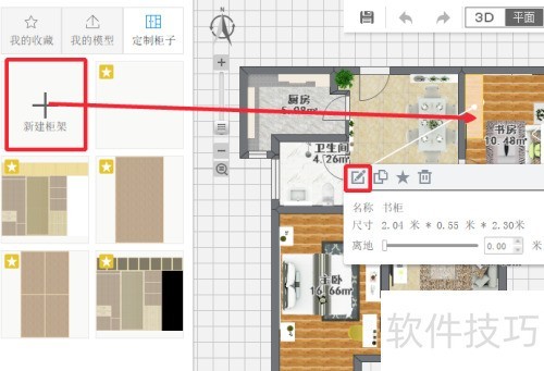 5、 从左侧素材库依次点击我的物品定制柜子新建柜架,把柜架拖入方案。左键选中柜子,点击编辑图标,进入定制界面。