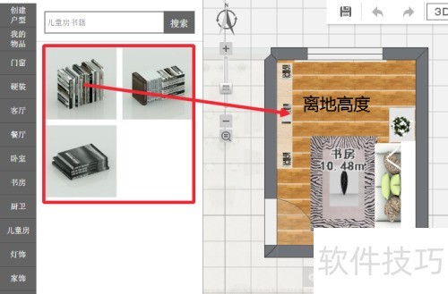 9、 从素材库查找书籍,把书籍拖入房屋,调整离地高度,再移至书柜对应位置即可。