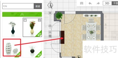 29、 在左侧找到花瓶,拖动喜欢的款式到博古架上,通过3D视角调整至合适的离地高度。