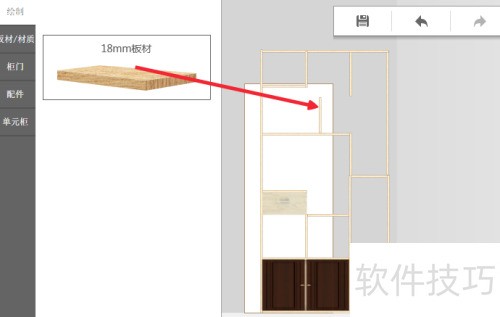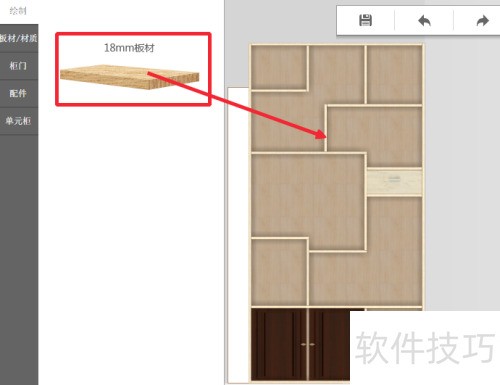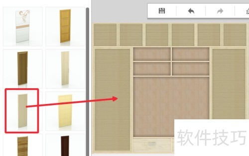 16、 从左侧选中柜门选项,将合适柜门拖入柜子空间摆放,柜门会自动适应柜子尺寸。